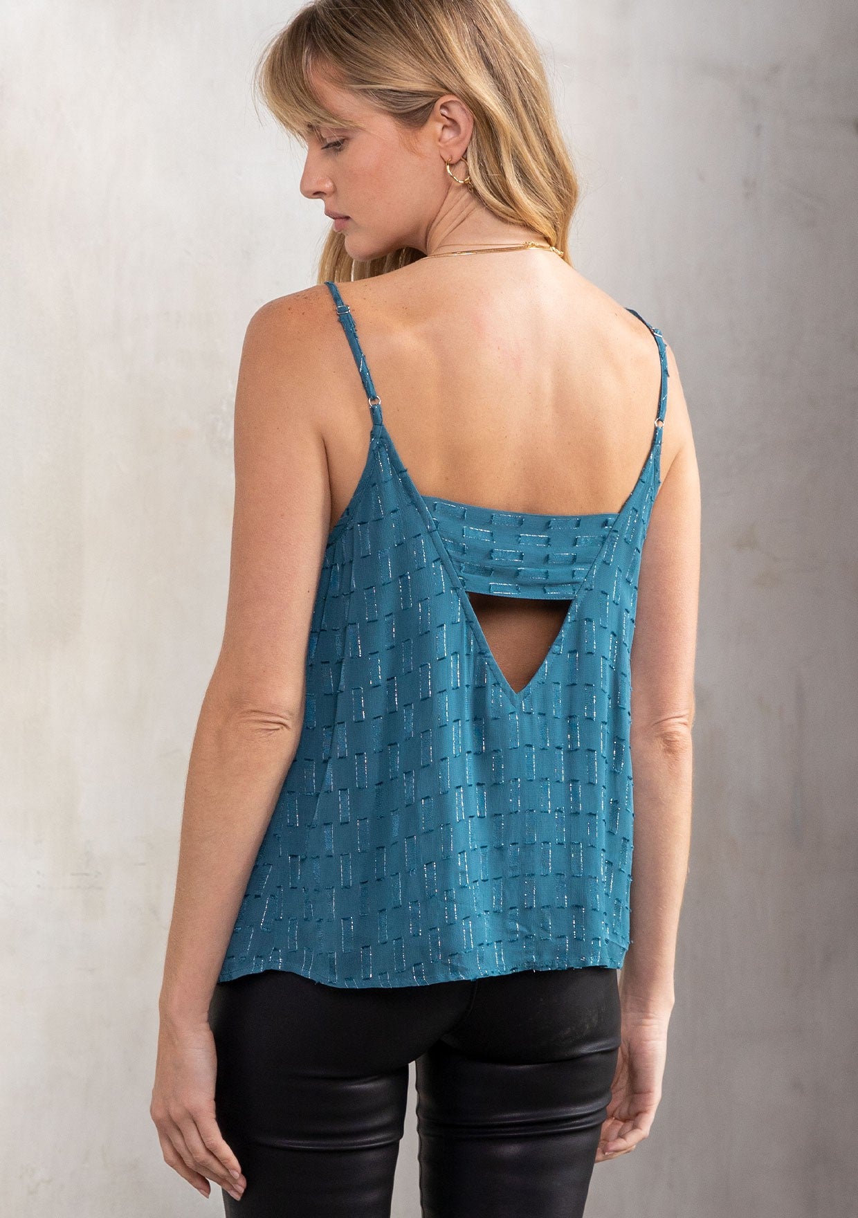 Sheer dressy tank top in a metallic clipped chiffon. Features a flowy relaxed fit, adjustable spaghetti straps, a ruffled round neckline, and a pretty back cut out detail. Lining attached.
