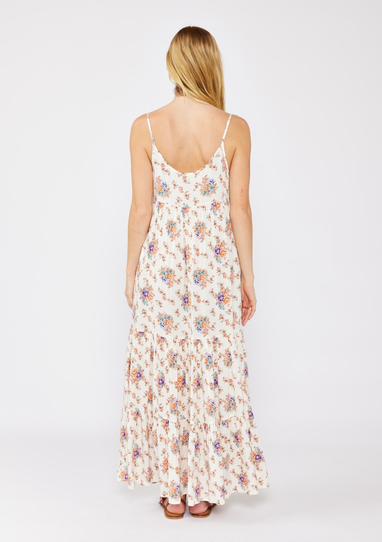 Tiered maxi dress features spaghetti straps and a button-front, complemented by a v-neckline with a scalloped edge and side pockets. It showcases a floral print and a relaxed fit, offering effortless elegance and timeless appeal.