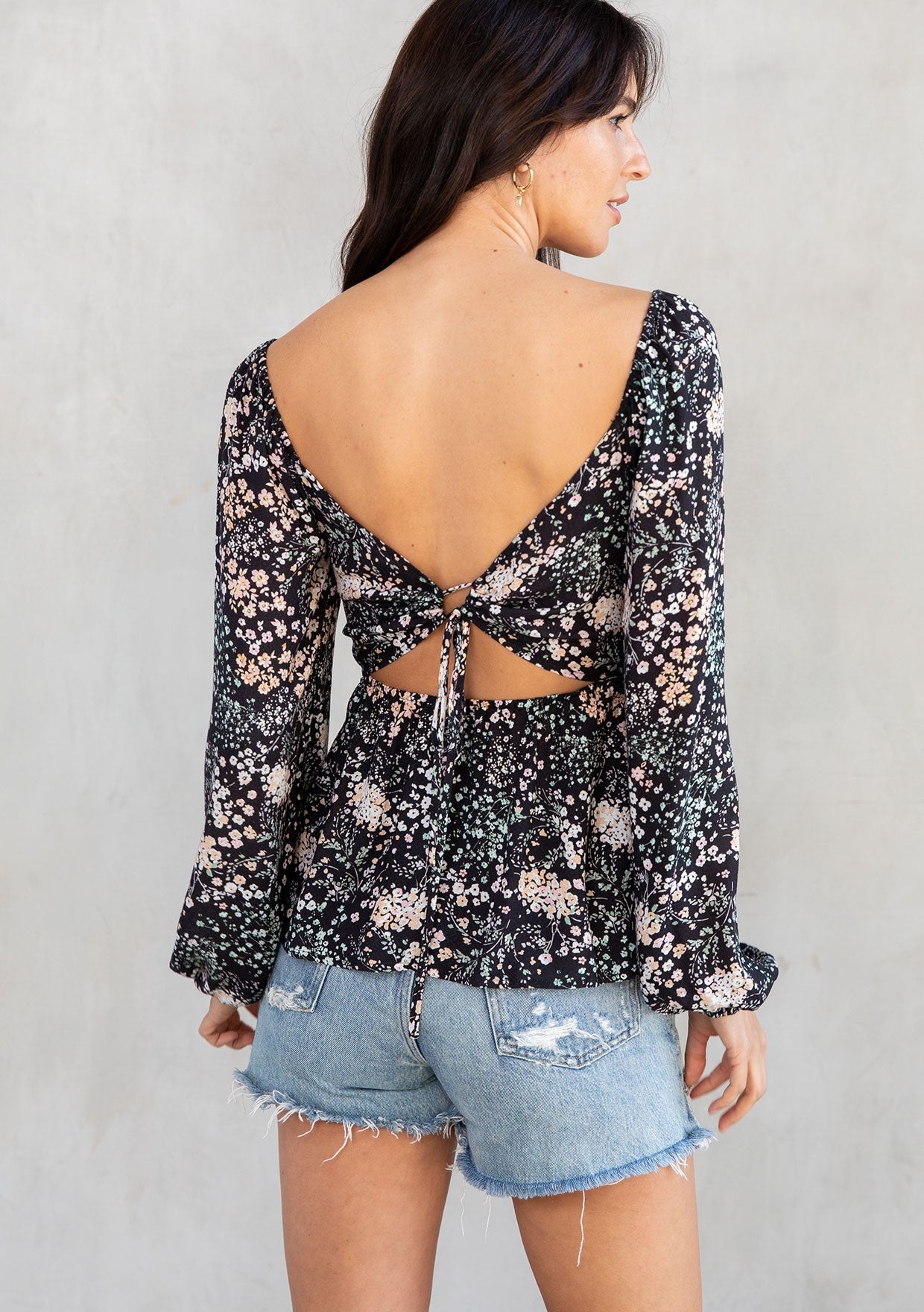 This chic long sleeve floral top with a flattering square neckline. Features a peplum waist, elastic cuff, and an open back with adjustable tie.
