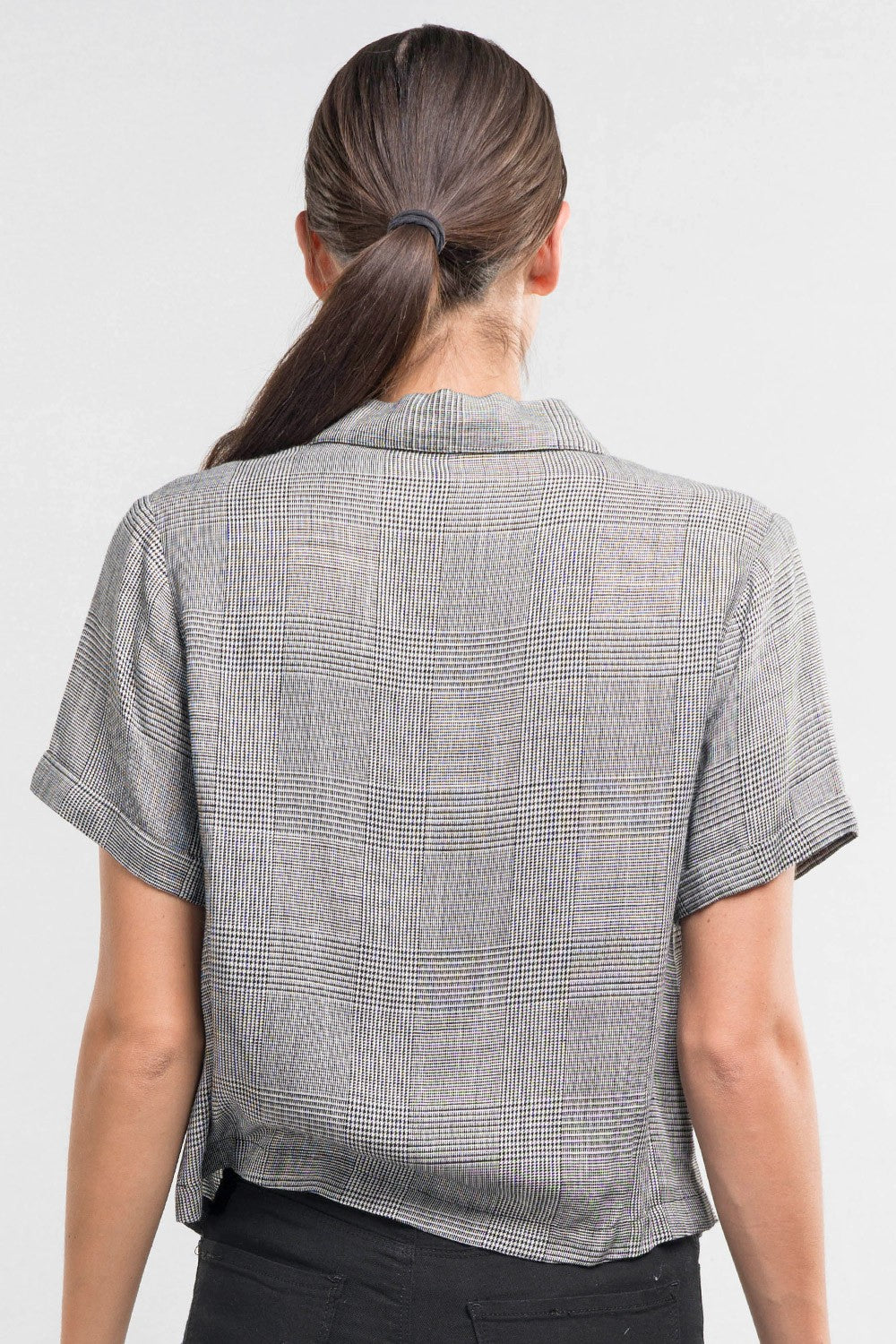 Yarn dye glen plaid, short sleeve twist front detailed collared top.