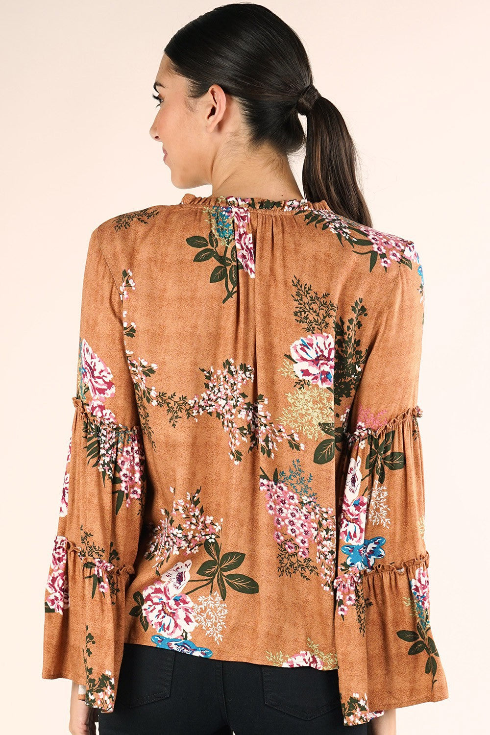 Floral printed bell sleeve top with neck tie and ruffle detail