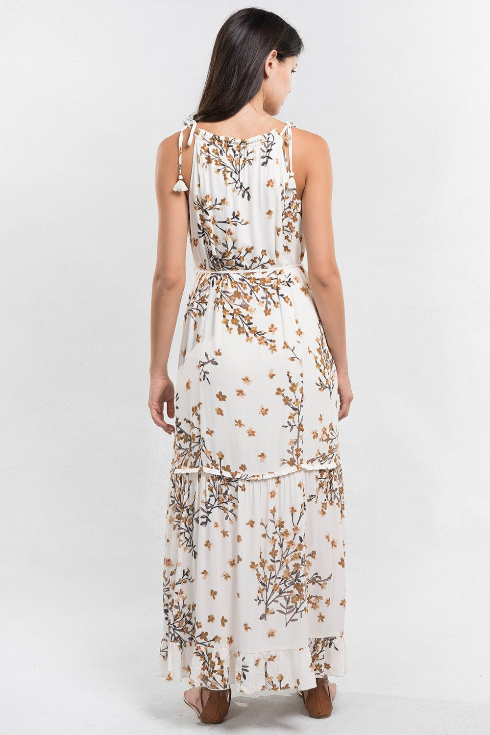 All over floral printed, dropped tiered maxi dress with self-belt and tie shoulder strap details.