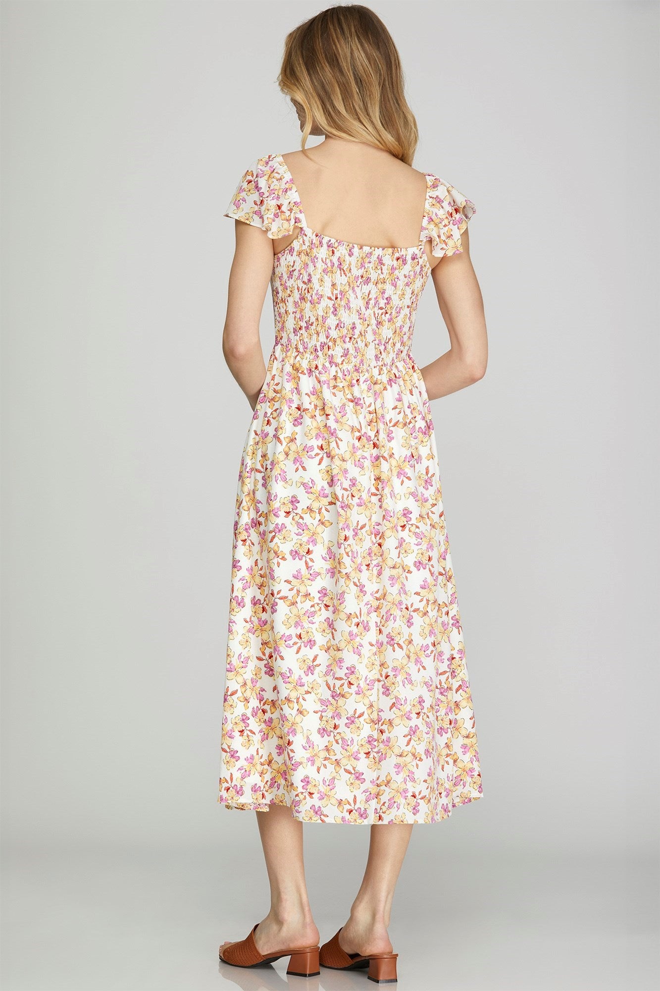 FLUTTER SLEEVE WOVEN FLORAL PRINT CENTER SLIT MIDI DRESSMODEL IS 5'8" AND MODEL IS WEARING SIZE SMALL